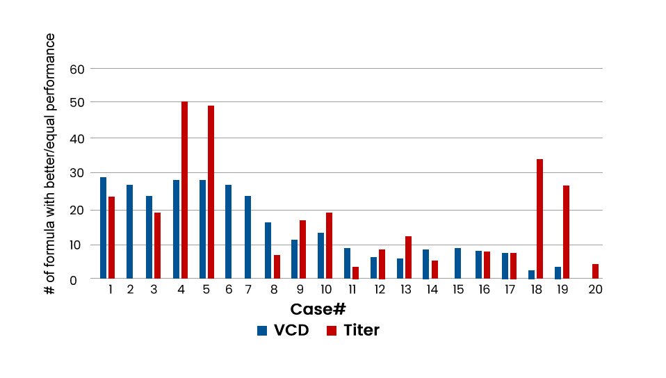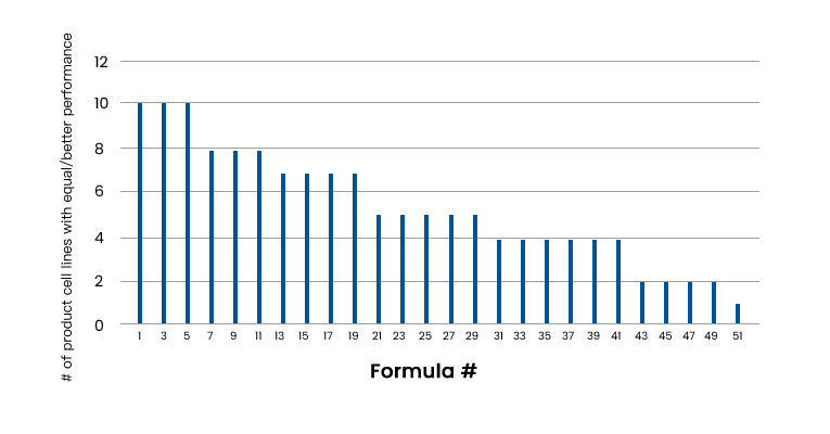 Using an AI-generated library of 50 media formulations, 64%–74% of tested formulations demonstrated superior VCD or titer performance compared with a commercial control.
