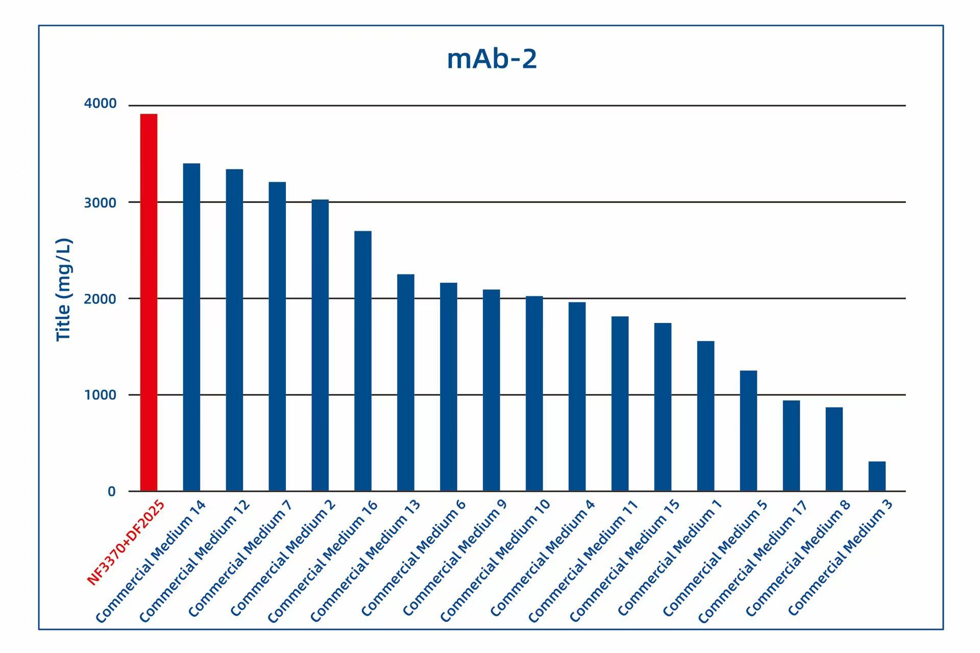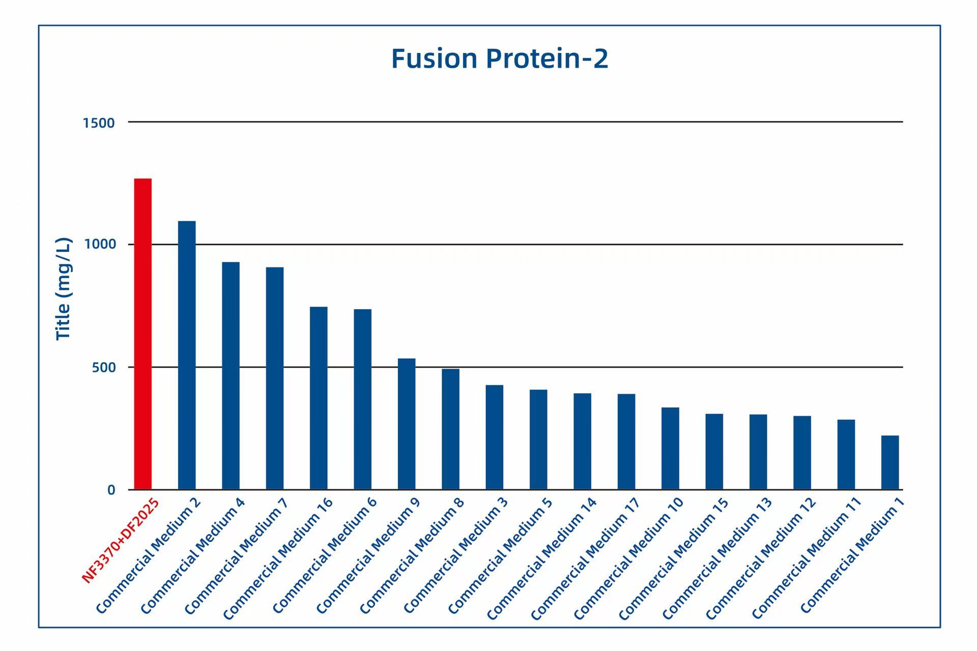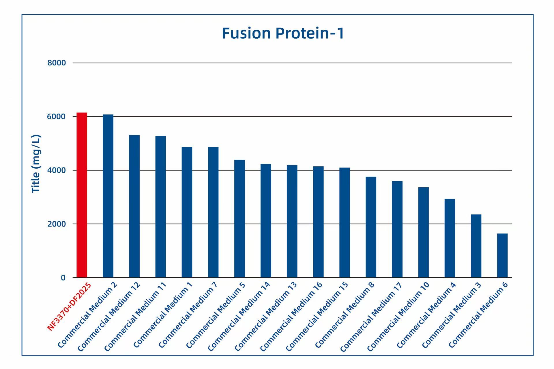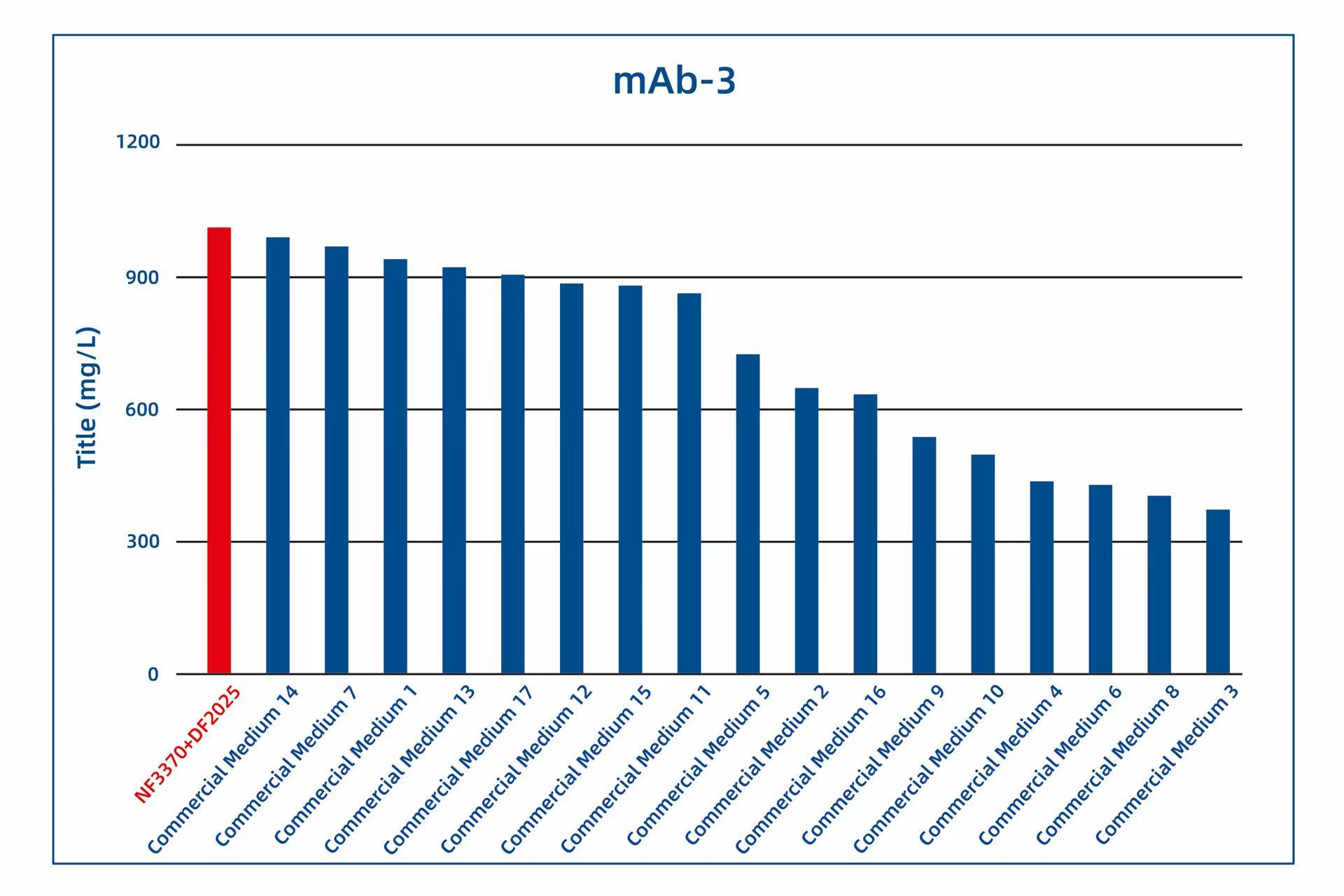 Since its launch, AlfaMedX (NF3370+DF2025) has received trial data from several of our customers. Comparative studies with 17 commercial media on cell line cultures for fusion proteins, mAbs, and BsAbs have demonstrated its significant advantages in protein yield and versatility. Trial data from 20 different cell lines showed that, compared to commercial media, GBB’s AlfaMedX (NF3370+DF2025) achieved expression levels at or above 90% of the top-performing commercial media in 9 cell lines, with its expression ranking consistently within the top 3.