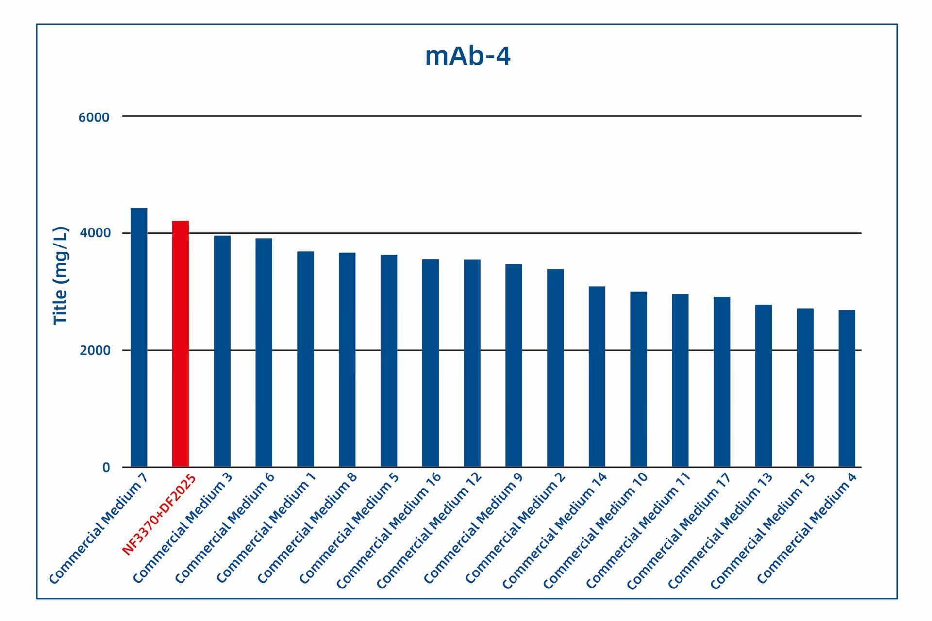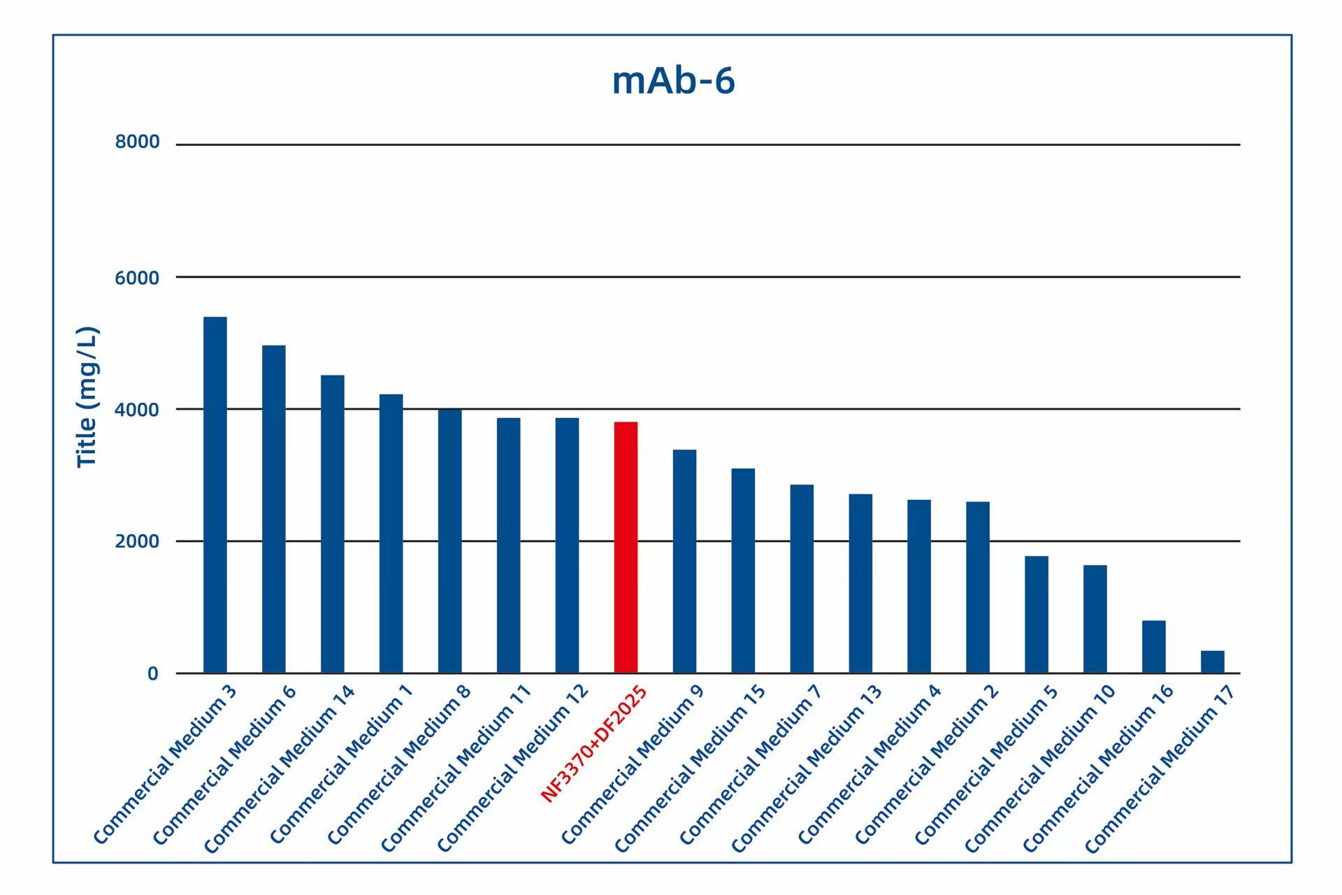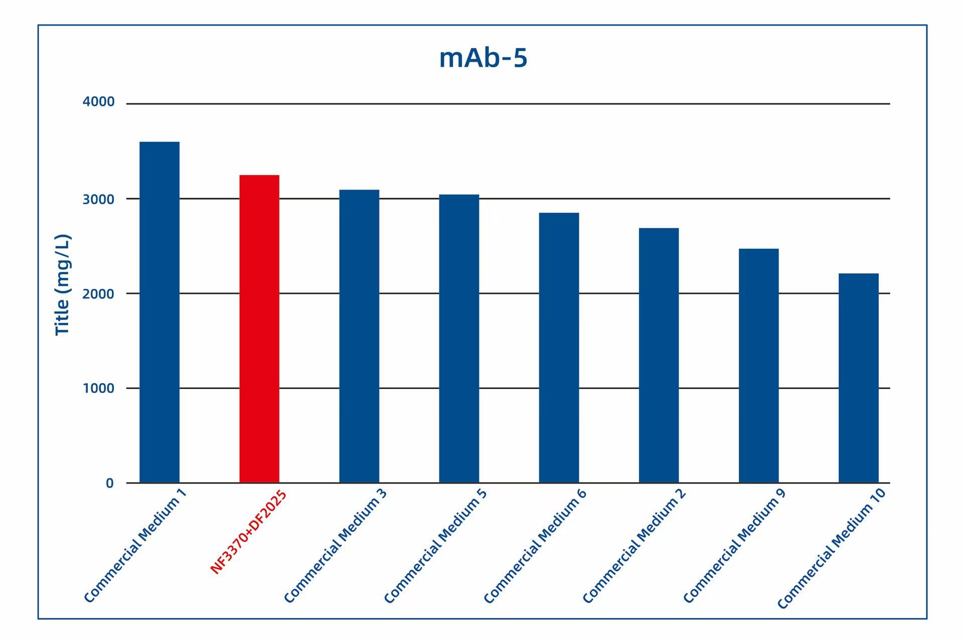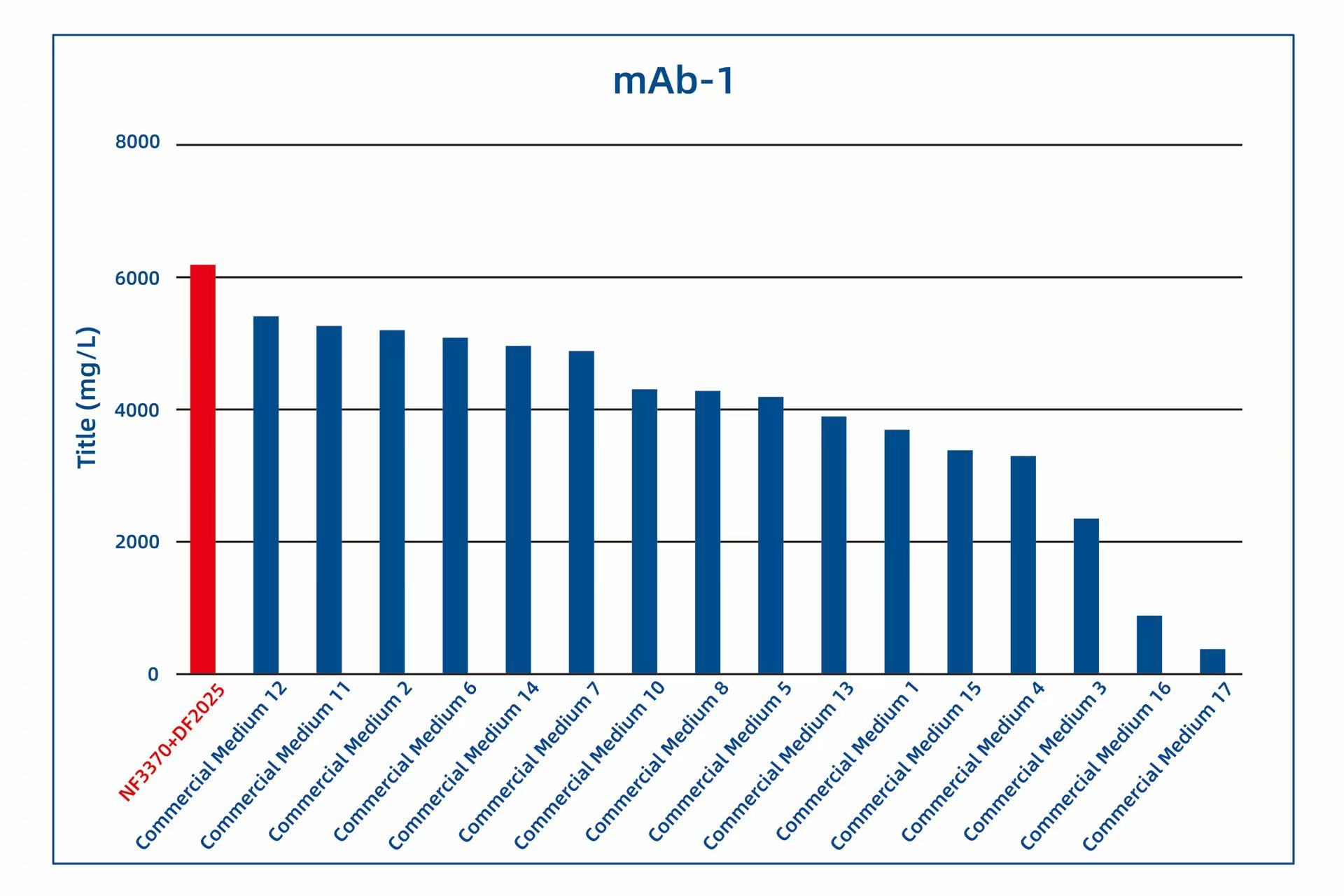 Since its launch, AlfaMedX (NF3370+DF2025) has received trial data from several of our customers. Comparative studies with 17 commercial media on cell line cultures for fusion proteins, mAbs, and BsAbs have demonstrated its significant advantages in protein yield and versatility. Trial data from 20 different cell lines showed that, compared to commercial media, GBB’s AlfaMedX (NF3370+DF2025) achieved expression levels at or above 90% of the top-performing commercial media in 9 cell lines, with its expression ranking consistently within the top 3.