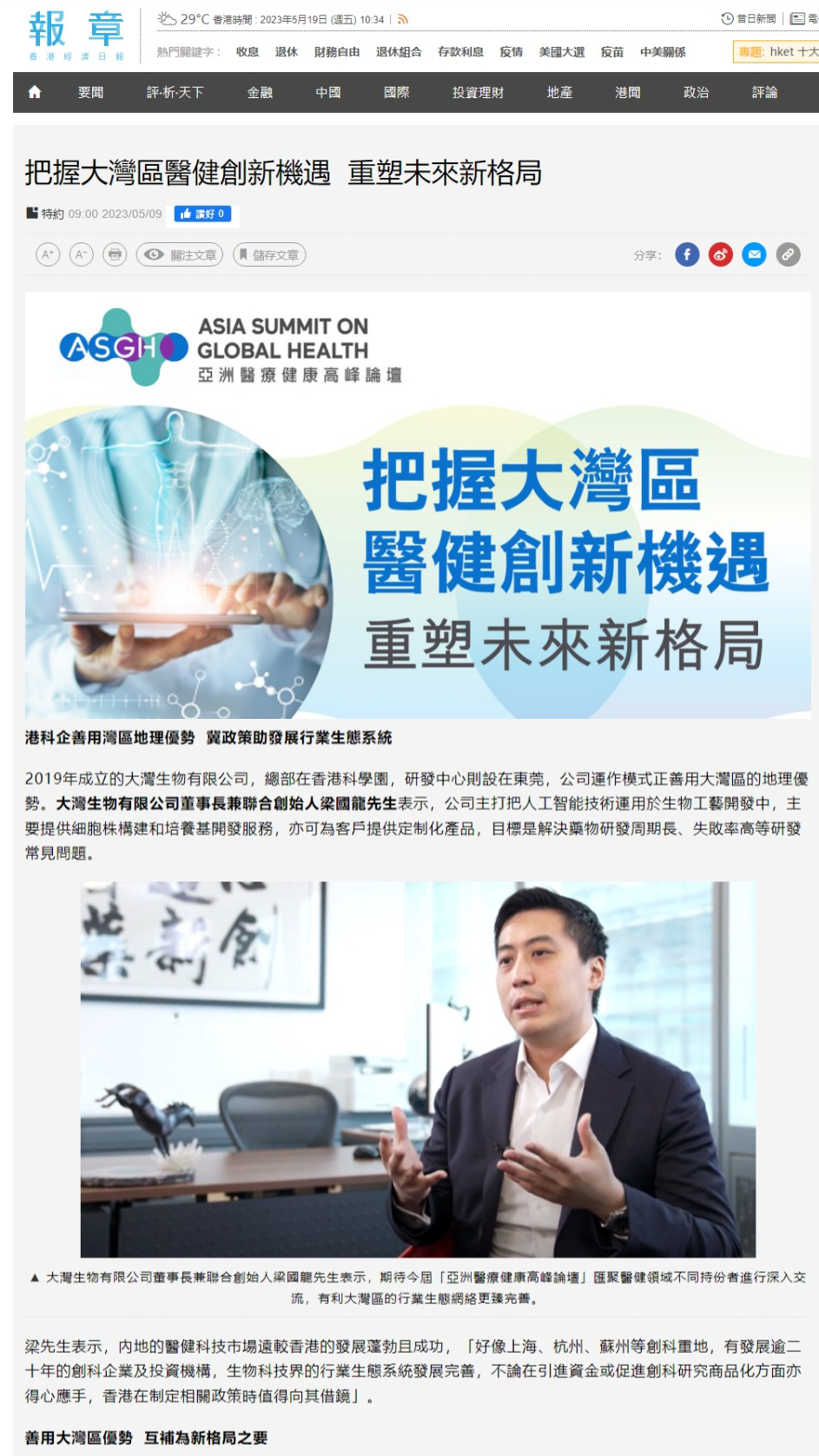 [HONG KONG, May 22, 2023] Recently, the third Asia Summit on Global Healthcare co-organized by the Government of the Hong Kong Special Administrative Region (HKSAR) and the Hong Kong Trade Development Council (HKTDC) was successfully held in Hong Kong. The ASGH attracted over 2,500 participants from 40 countries and regions. The Medical Fair welcomed over 10,000 visitors from 56 countries and regions. Mr. John Lee, the Chief Executive of HKSAR attended the forum and delivered a speech. Ms. Yu Yanhong, the Member of Leading Party Member’s Group of the National Health Commission, and Dr. Tedros Adhanom Ghebreyesus, Director-General of the World Health Organization, delivered speeches. Great Bay Bio team attended the event and presented the AI-enabled Cell Engineering Platform, and had a great experience and discussed the development prospects and business opportunities of global public health, medical technology and medical investment with health officials, international medical experts and investors from all over the world.